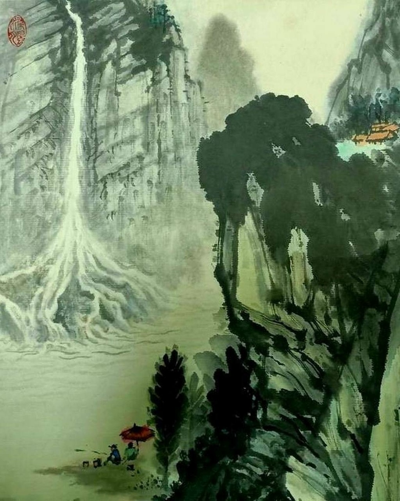 峭壁突峰飛瀑瀉 悠閒垂釣笑聊間
